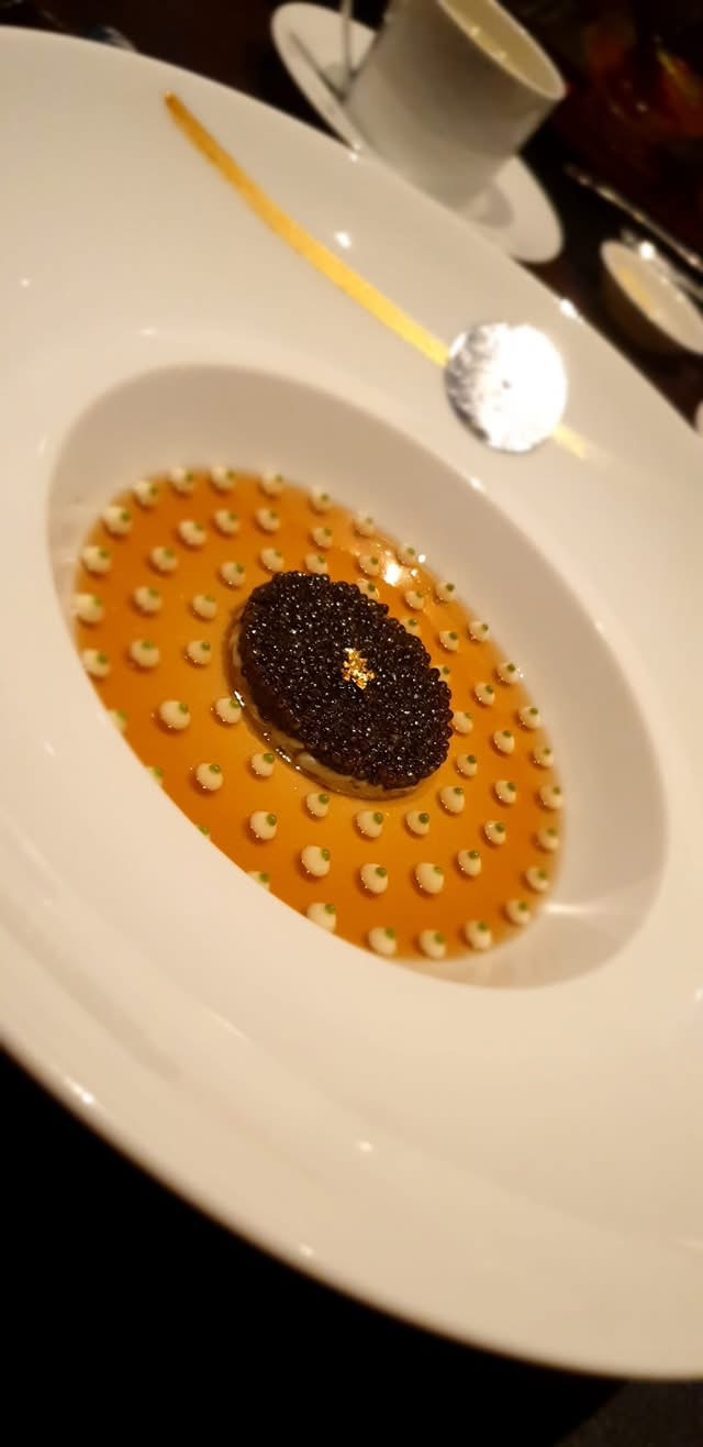琥珀色的醬汁中整齊排列著小巧精緻的點綴,中心則是一圈閃爍著金箔的魚子醬,每一個細節都展現出極致的精緻與層次感。